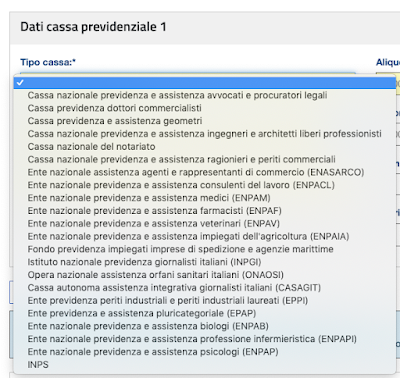 Una volta messo il flag, nella pagina compare uno spazio per inserire i dati della rivalsa o del contributo integrativo. Il primo elemento da scegliere è l'ente previdenziale cui apparteniamo: